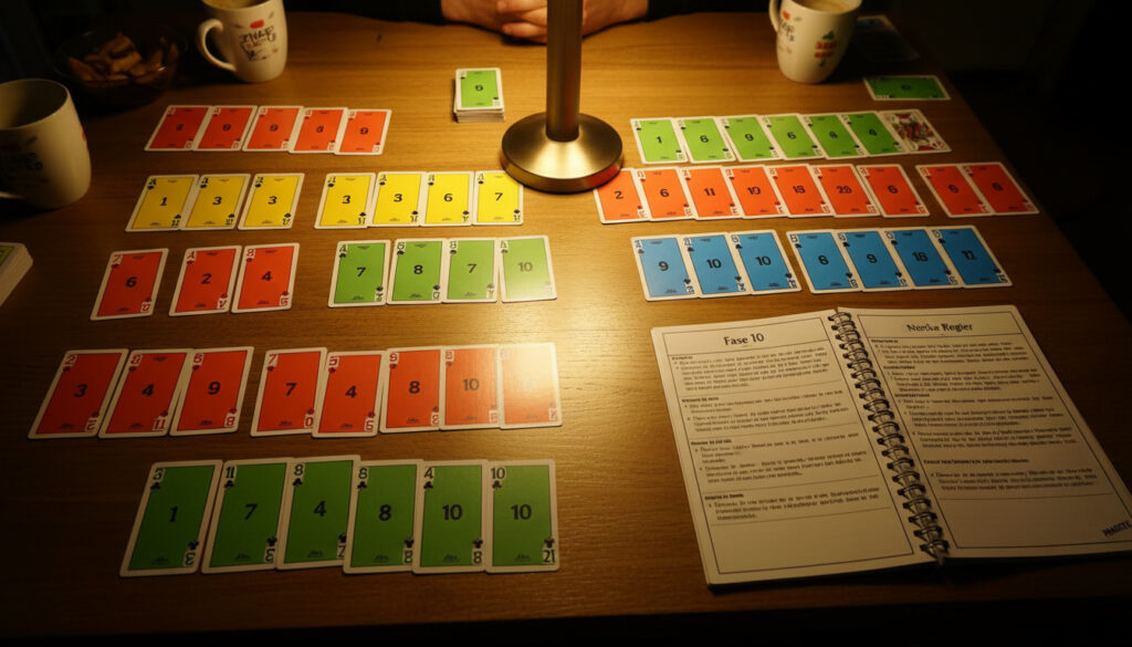 - Rundebasert: Spillet fortsetter over flere runder til én spiller har fullført fase 10 og oppnådd lavest totalpoeng.