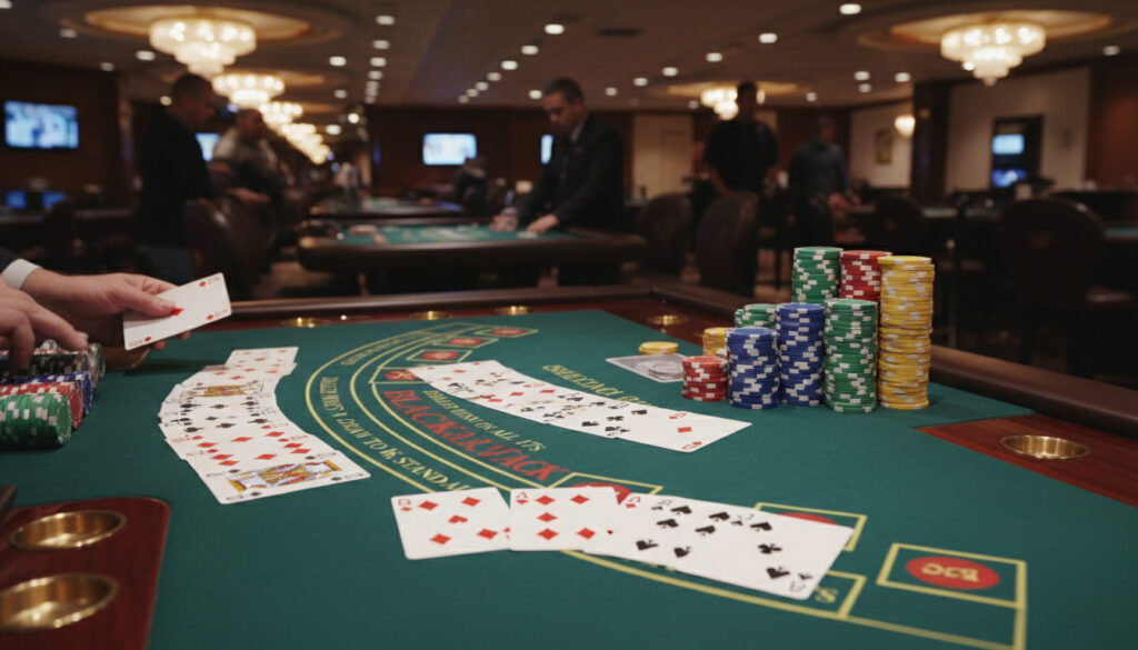 Det anbefales å følge en konsistent blackjack strategi basert på grunnleggende regler og kortverdier for å minimere husets fordel. - Hvordan håndteres spill med 5 kort?