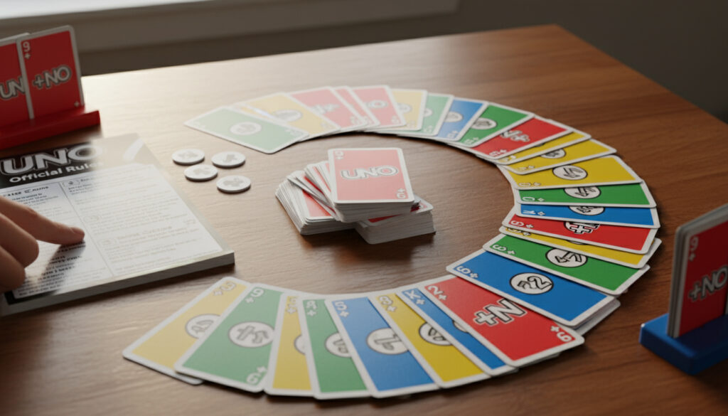 Uno handler om å bli kvitt alle kortene ved å matche farge, tall eller symbol. Husk å rope «Uno!» og bruk spesialkort strategisk for å forstyrre motstanderne. Husregler som å legge flere kort eller bytte hånd/kort kan endre spillstrategien.
